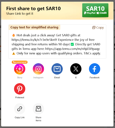 يمكنك الحصول على مكافأة 40 ريال سعودي إذا نجحت في جلب مستخدم جديد واحد لتنزيل تطبيق Temu باستخدام أكوادك أو روابطك. المزيد من المستخدمين، المزيد من المكافآت! 💰 (40 درهمًا إماراتيًا/6 دينار بحريني/30 ريالًا قطريًا/3 دينار كويتي/6 ريال عماني/2 دينار أردني)