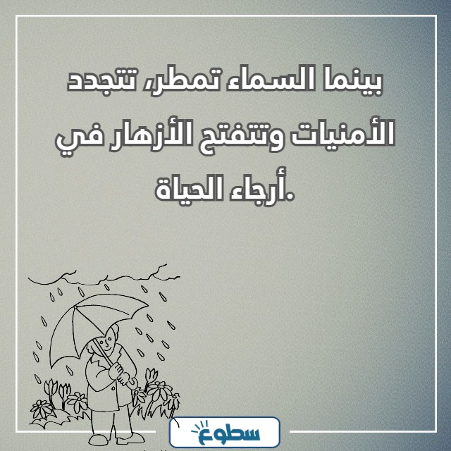 | Rain rearranges the chapters of life, erases sorrows and writes a new chapter of hope. | المطر يُعيد ترتيب فصول الحياة، يمسح الأحزان ويكتب فصلًا جديدًا من الأمل. |