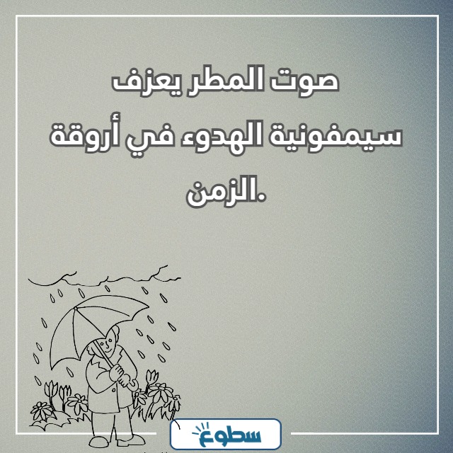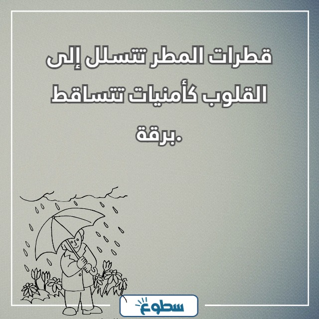 | In moments of rain, time begins to change, and hearts wash away the traces of despair. | في لحظات المطر، يبدأ الزمن في التبدل، ويغسل القلوب من آثار اليأس. |