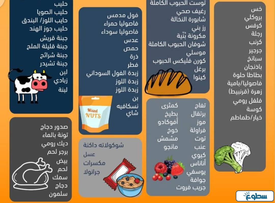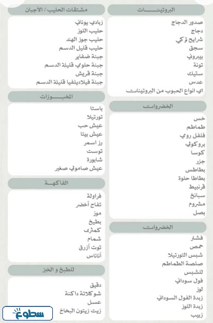 - الخضروات والفواكه: تشمل قائمة المقاضي تشكيلة من الخضروات والفواكه الطازجة لضمان تنوع وتغذية متوازنة.