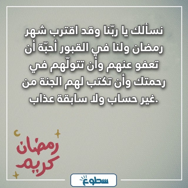 | العبارة الخامسة | قد اقترب شهر رمضان المُبارك، وقد فاضت بنا مشاعر الشوق إلى من سبقونا إلى رحمة الله، فاللهم نسألك أن تعفو عنهم، وأن تتولّهم في رحمتك، وأن تكتب لهم الجنة من غير حساب ولا سابقة عذاب. |