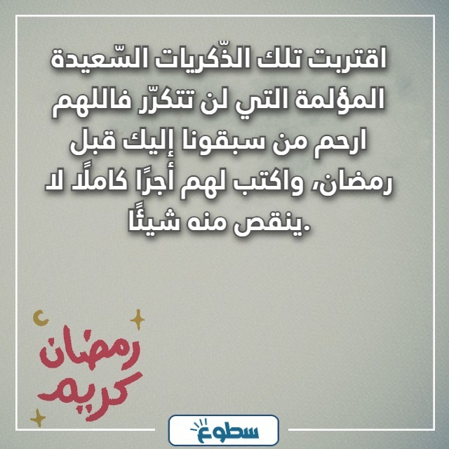 | العبارة الثالثة | قد اقترب موسم الخير، واقتربت تلك الغصّات الكبيرة التي تُولد مع بداية الذّاكرة، فاللهم ارحمنا برحمتك الواسعة واكتب لمن سبقونا إليك أجرًا عن صيام الشّهر واجعل لنا نصيبًا في صُحبتهم يوم نلقاك يا كريم. |