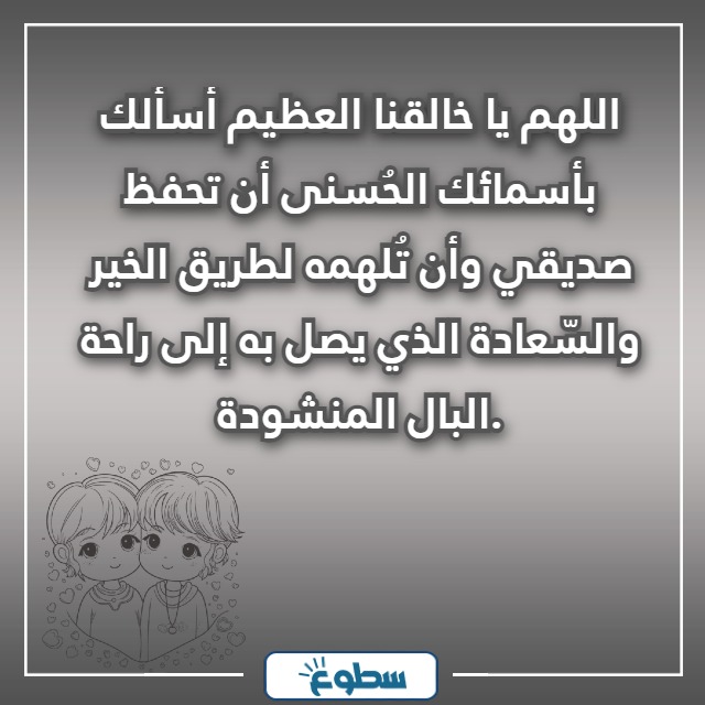 - اللهم يا أرحم الرّاحمين ويا عون السّائلين ويا مُجيب المُضطرّين، أسألك أن تكتب لصديقي التوفيق والسّعادة وأن تحفظ له الأهل والعائلة، وأن تزيده من الخير والتوفيق في مسارات العُمر، وأن تدله على الخير في كلّ مكان.