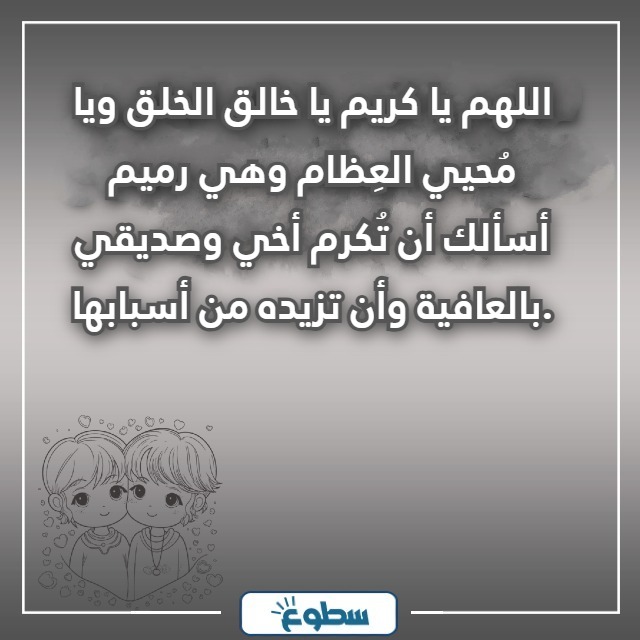 - اللهم أنتَ القادر الكريم لذي لا يُعجزه في الدّنيا ولا في الآخرة أمر، أسألك يا ربّي أن تتولاني برحمتك التي وسعت كلّ شيء، اللهم ارفع عن صديقي ما أنتَ به أعلم من الألم والمرض، واجعل له خيرًا ورزقًا وفيرًا.