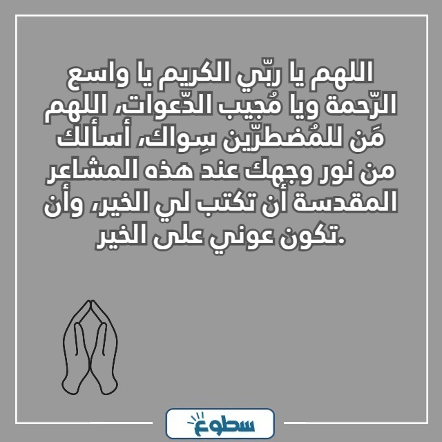 - اللهم يا ربّي الكريم يا واسع الرّحمة ويا مُجيب الدّعوات، اللهم مَن للمُضطرّين سِواك، أسألك من نور وجهك عندي هذه المشاعر المقدسة أن تكتب لي الخير، وأن تكون عوني على الخير، وأن تحفظني لما فيه الخير.