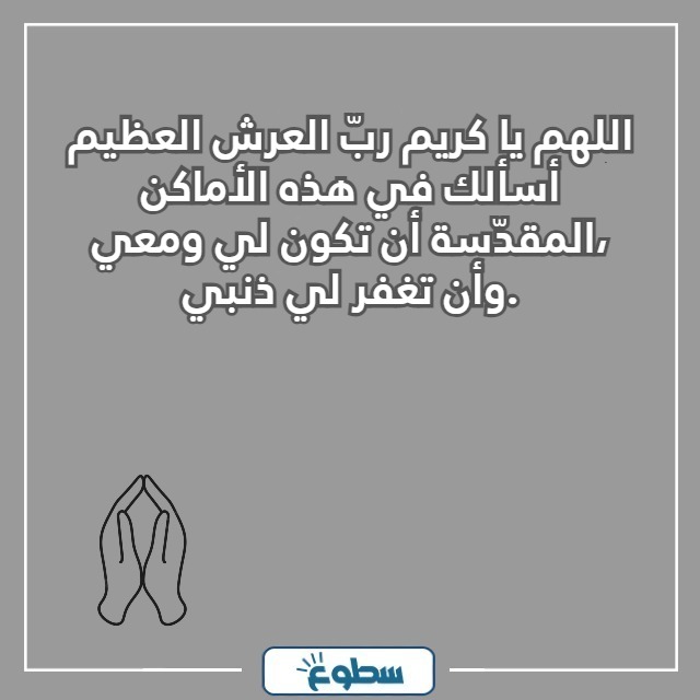 - اللهم يا كريم ربّ العرش العظيم أسألك في هذه الأماكن المقدّسة أن تكون لي ومعي، وأن تغفر لي ذنبي، وأن لا تكلني إلى أحدٍ سِواك، اللهم ارفع مقتك وغضبك عنّي، واجبرني جبرًا يليق بعظمتك ووجودك يا ذا القوّة المتين.